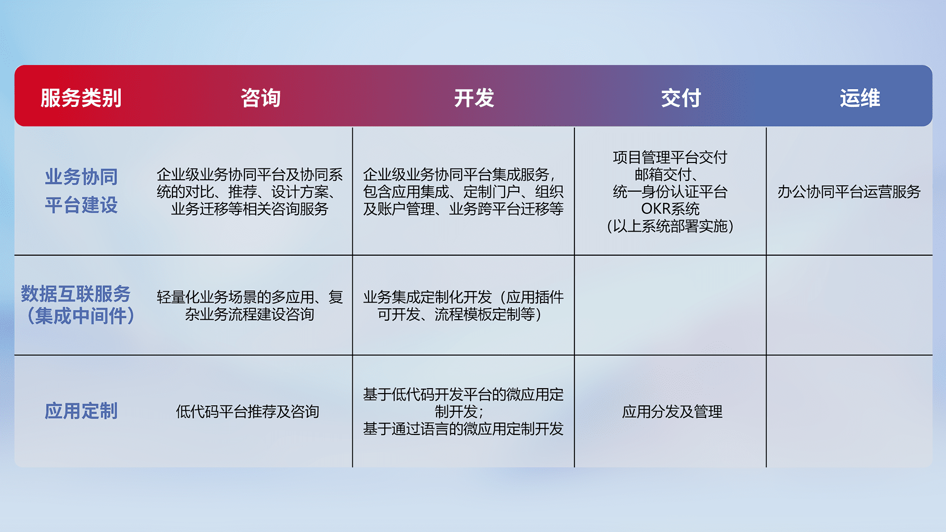 针对钉钉、、、企微、、、IDaas等平台级产品提供产品的规划、、、、方案、、交付、、、、定制化开发等服务,,,,实现如统一协同办公、、、智能客户服务、、、、混合会议管理、、、智能数据查询、、、、等业务场景,,实现数字化转型。。