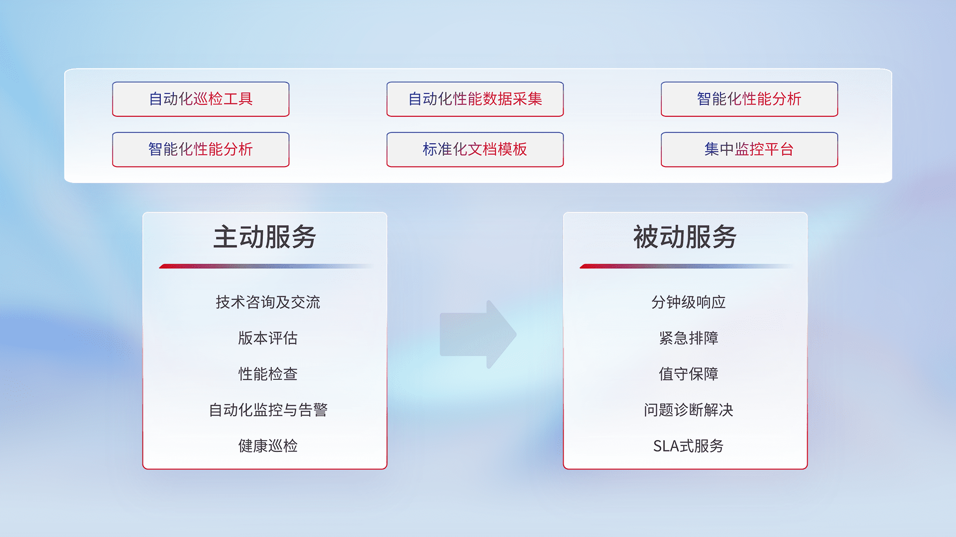 智能化工具和标准化文档,,,保障服务质量,,提供主动服务(包含技术咨询、、版本评估、、、、性能检查、、、自动化监控与告警、、、健康巡检)和被动服务包含(分钟级响应、、紧急排障、、、、值守保障、、、问题诊断解决、、、SLA服务)。。。